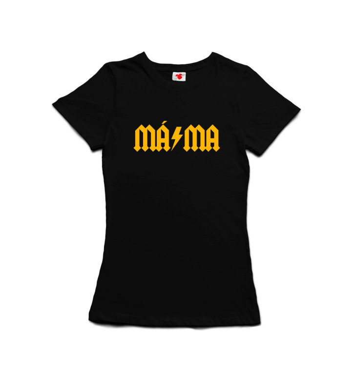 Máma na plný plyn. Tričko Máma ve stylu slavného AC/DC loga je dárek pro maminku, co zvládá všechno a ještě u toho rockuje. Vtipné tričko s potiskem pro každou mámu s osobností — skvělý dárek k narozeninám, MDŽ nebo Dni matek.